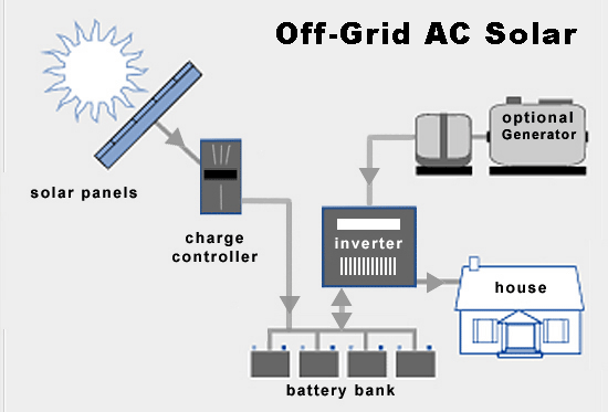 Off-grid solar power also stores DC electricity in batteries. The addition of an inverter allows this system to convert DC electrical current coming from the batteries into AC or alternating current. AC is the standard form of electricity for anything that "plugs in" to utility power and is the appropriate current for common household appliances.
